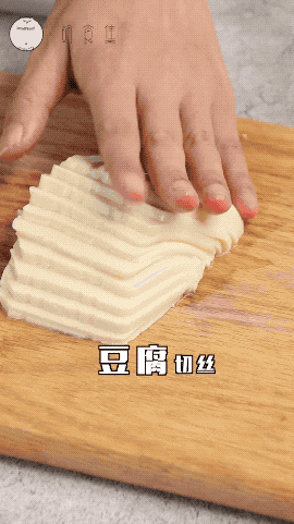 2.豆腐切丝,不是很丝也没关系,看着像那么回事就差不多了。泡发好的木耳切丝,别让木耳粘手,弹两下。如果你愿意,也可以把金针菇一根根撕好。