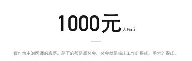 “不同职称的基本工资相差不多。我作为主治医师的底薪是每月一千元(人民币),主任医师也就比我多两三千块钱。剩下的都是靠奖金,奖金就是临床工作的提成、手术的提成,按照比例分配。”