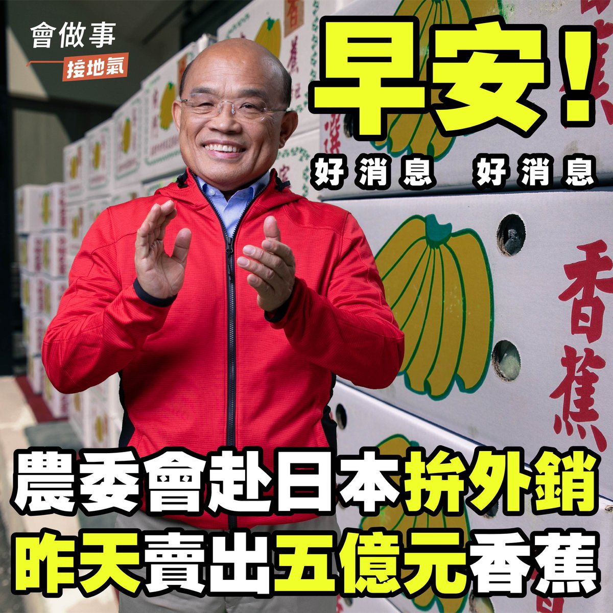 早安! 農委會與農民一起努力,幫優質的台灣農產品到國外找市場,在昨天一天內,就在日本最大食品展賣出了一萬噸、五億元的台灣香蕉! 會做事,要分享,一起把好消息跟好朋友分享!