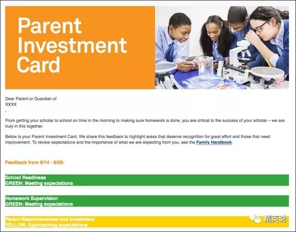 同时,学校还会根据家长的配合程度给他们打分,叫做Parent Investment Card(家长投入卡),红色意味着不合格,绿色是合格,黄色是需要努力。