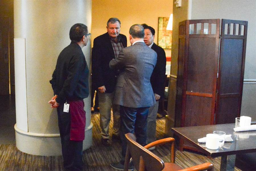韓國瑜美西時間15日在史丹佛大學演講,當時與該校學者、前美國駐阿富汗大使艾江山相談甚歡,艾江山臨時提出邀約,16日一早趕到韓國瑜下榻的飯店,倆人在餐廳共進早餐,對談氣氛非常融洽,席間不時傳出笑聲。